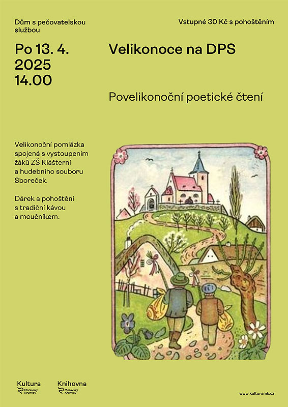 • 13. dubna – pondělí Velikonoce na DPS pro knihovníky z Jižní Moravy - povelikonoční poetické čtení spojené s vystoupením žáků ZŠ Klášterní a hudebního souboru Sboreček pod vedením p. uč. Drtílkové a s hudebním doprovodem p. uč. Havlišové, p. uč. Mandátové a p. Burianové. Velikonoční pomlázka-dárek s tradiční kávou a moučníkem. Začátek ve 14 hod. na Domě s pečovatelskou službou, vstupné 30,-Kč s pohoštěním
