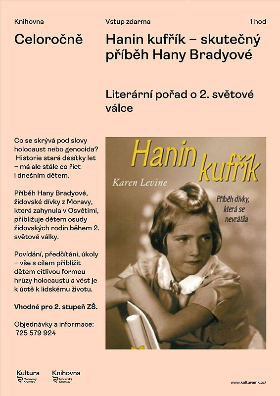 • V průběhu měsíce května – Literárně - výtvarný pořad Hanin kufříkCo se skrývá pod slovem holocaust nebo genocida? Jak k tomu mohlo dojít? Historie stará desítky let. Má smysl se k ní dnes vracet? Hanin kufřík je skutečný příběh židovské dívky Hany Bradyové, pocházející z Nového města na Moravě. Stal se svědectvím hrůzné minulosti, ale i nadějí pro budoucnost. Hana zahynula v nacistickém vyhlazovacím táboře v Osvětimi.