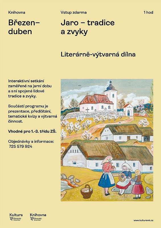 • V průběhu měsíce března – Jarní literární a výtvarná dílnička – tradice a zvyky daného období spojené s předčítáním a rukodělnou činností-herbář s jarními kytičkami. Vhodné pro žáky I. stupně ZŠ v rámci projektu Celé Česko čte dětem