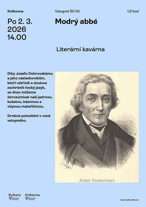 • 2. března – pondělí Literární kavárna – Modrý abbé. –Díky Josefu Dobrovskému a jeho následovníkům, kteří vzkřísili a doslova zachránili český jazyk se dnes můžeme dorozumívat naší jadrnou, košatou, básnivou a vtipnou mateřštinou. V příjemném prostředí a společenství připomene Mgr. Eva Kopčilová osudy českých obrozenců.