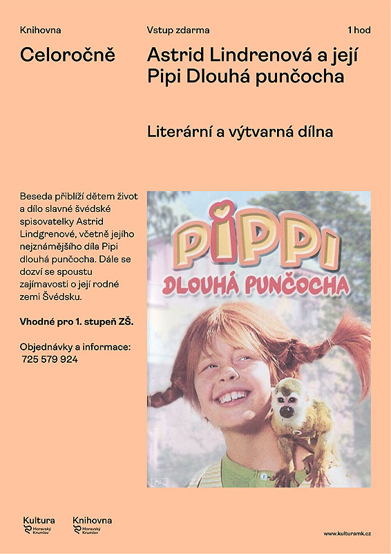 • V průběhu měsíce dubna – Literárně-výtvarná dílnička na téma Astrid Lindgrenová a její Pipi Dlouhá punčocha. První prezentace přiblíží dětem život a dílo slavné švédské spisovatelky včetně jejího nejznámějšího díla. Ve druhé prezentaci se žáci doví spoustu zajímavostí o autorčině rodné zemi. Spojené s předčítáním, kvízy a rukodělnou činností-vlajka Švédska nebo postavička Pipi. Vhodné pro žáky I. stupně ZŠ v rámci projektu Celé Česko čte dětem